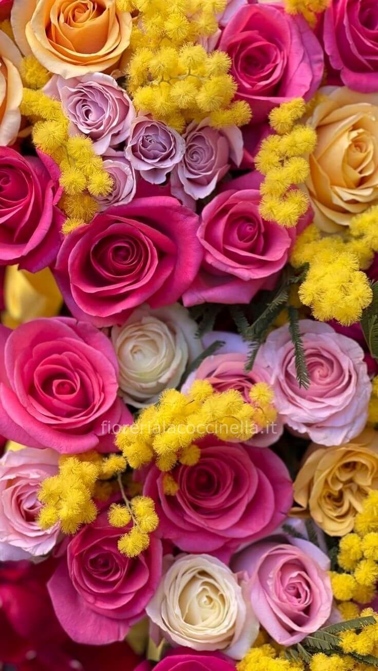 Bouquet di ROSE MONOCOLORE IN BASE ALLA NOSTRA DISPONIBILITA' e MIMOSA. L'omaggio è sempre confezionato con carta o materiali simili e fiocco colorato, secondo la nostra sensibilità e come d'uso locale.